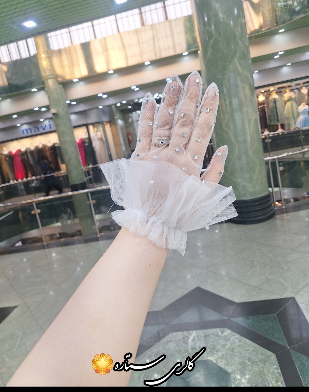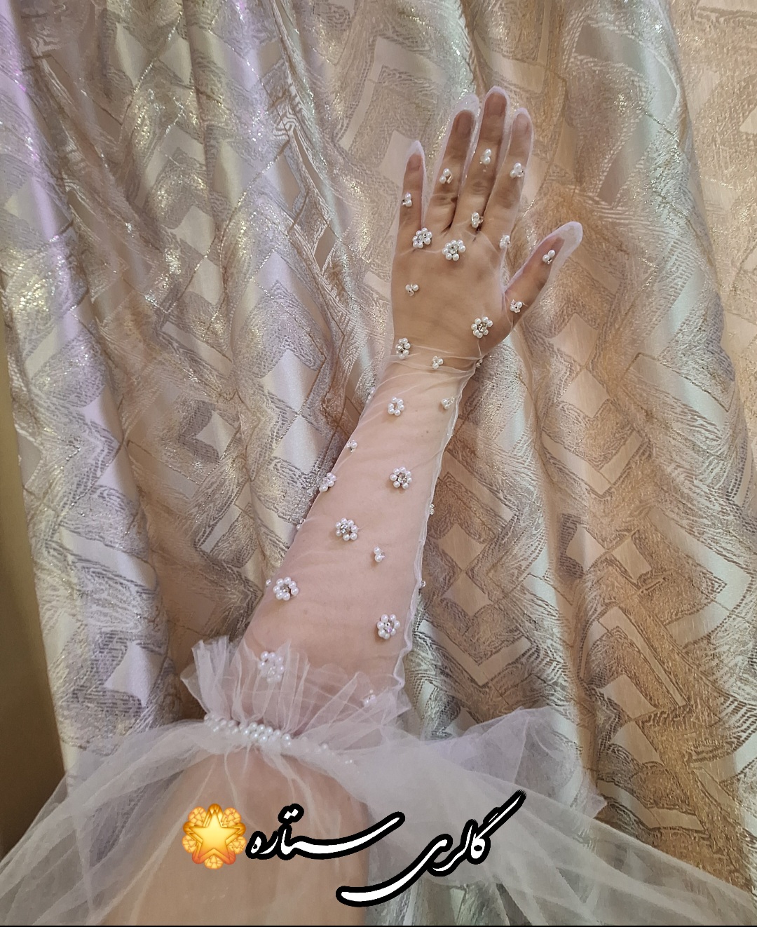 دستکش مجلسی تور با دیزاین مروارید پانچ و چین خامه دوزی