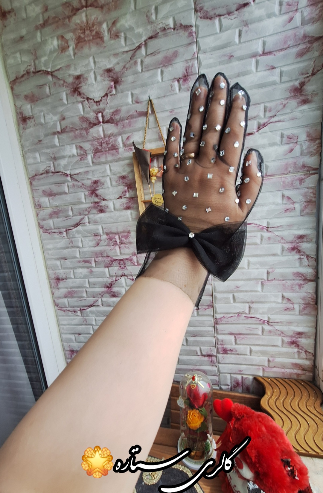 دستکش مجلسی توری با دیزاین پاپیون و سنگ اتریشی
