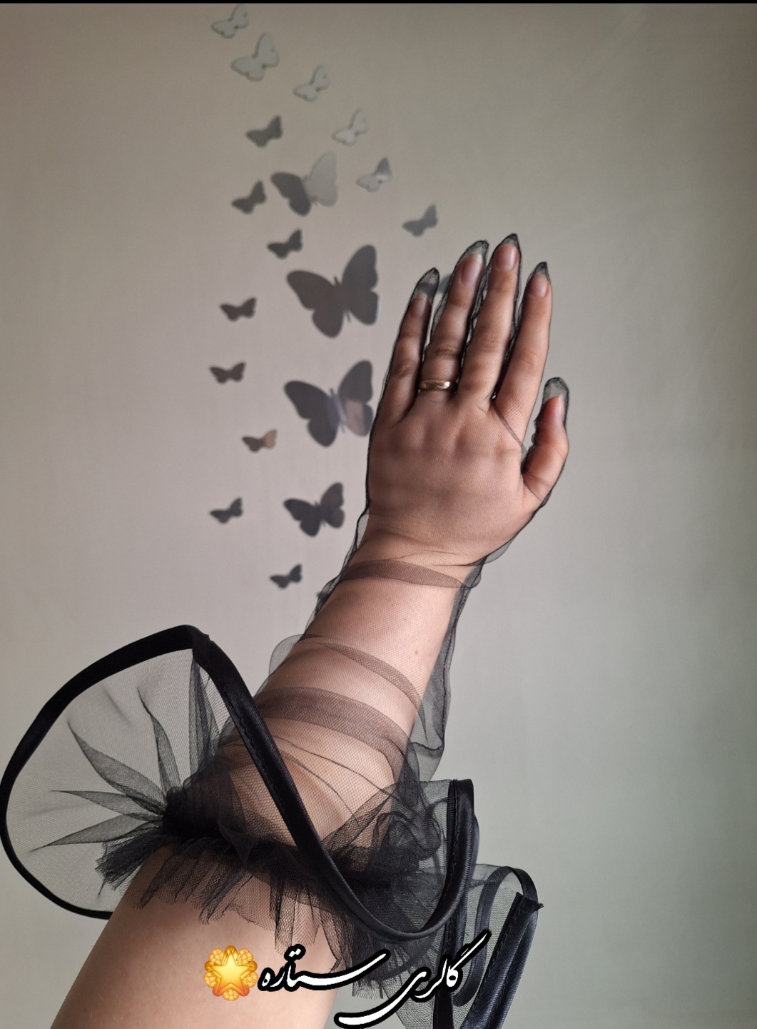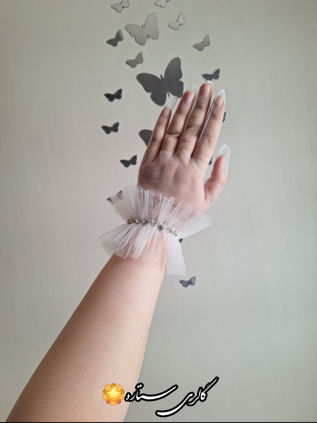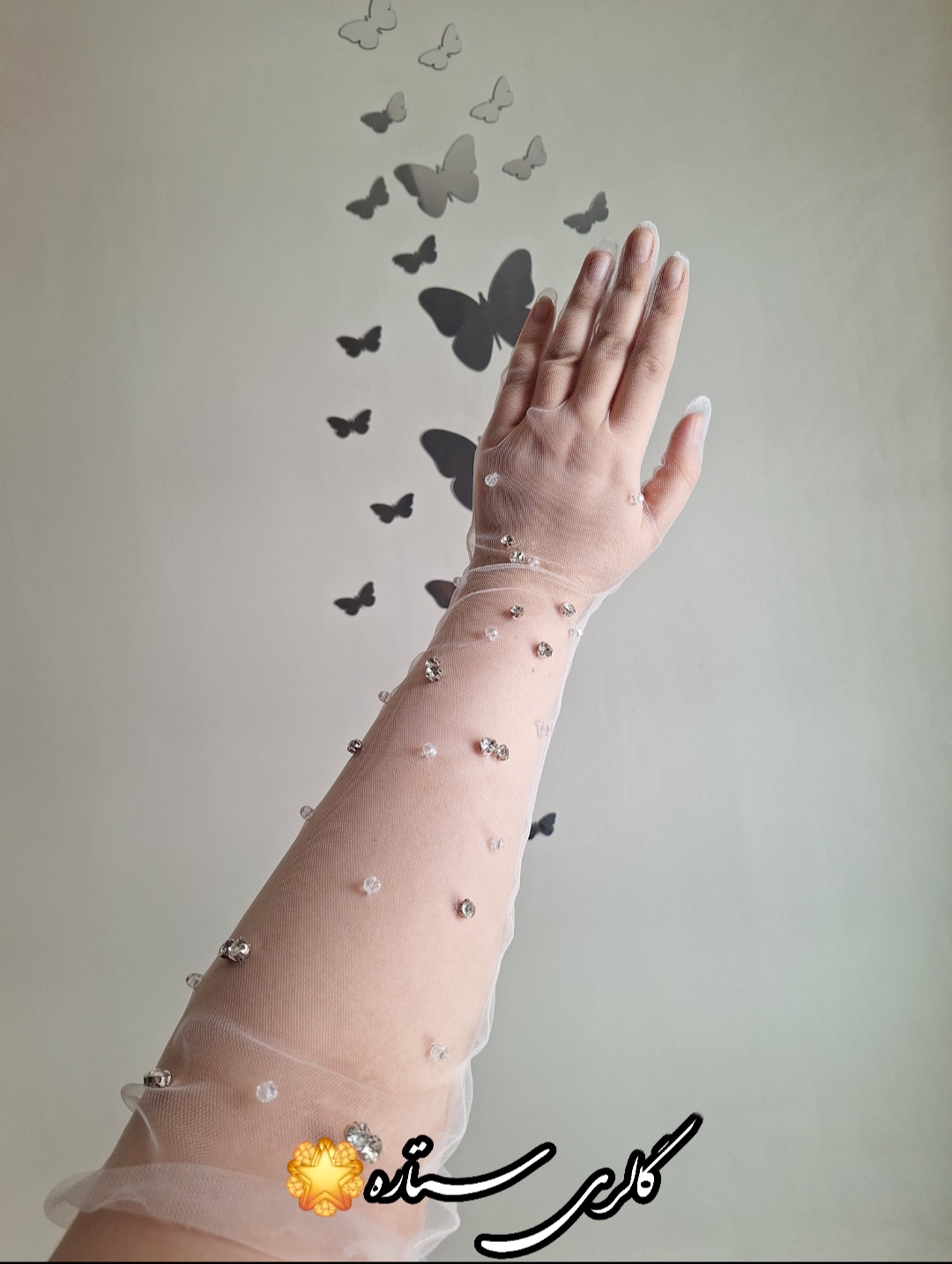 دستکش مجلسی زنانه طرح پاپیون – دیزاین شده با سنگ اتریشی و تور ظریف فرانسوی
