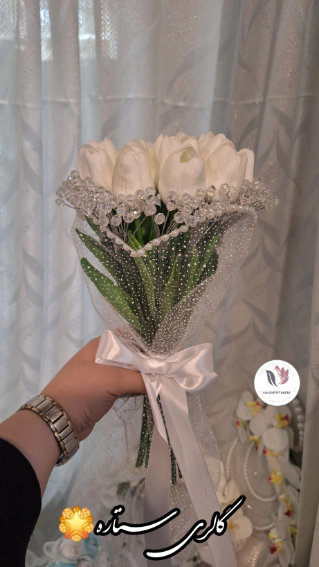 دسته گل عروس لاله لمسی وارداتی با دیزاین کریستال دستساز و تورمرواریدی
