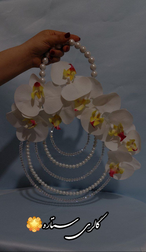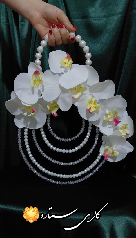 دسته گل عروس ارکیده لمسی سبک اروپایی با دیزاین سنگ کریستال و مروارید