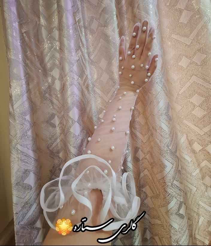 دستکش عروس توری چین خامه ای با دیزاین فاخر سنگ مروارید
