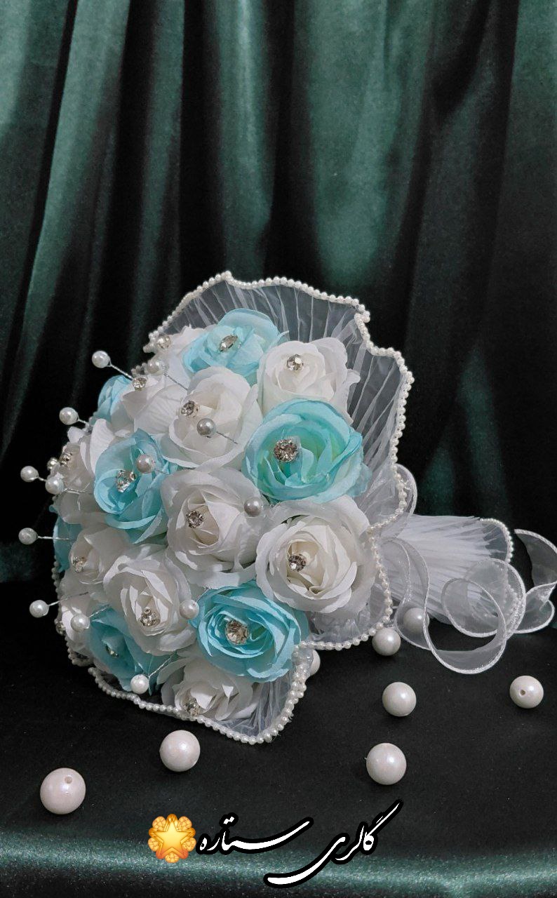 دسته گل عروس رزهلندس وارداتی سفید و ابی با دیزاین مروارید و سنگ چک