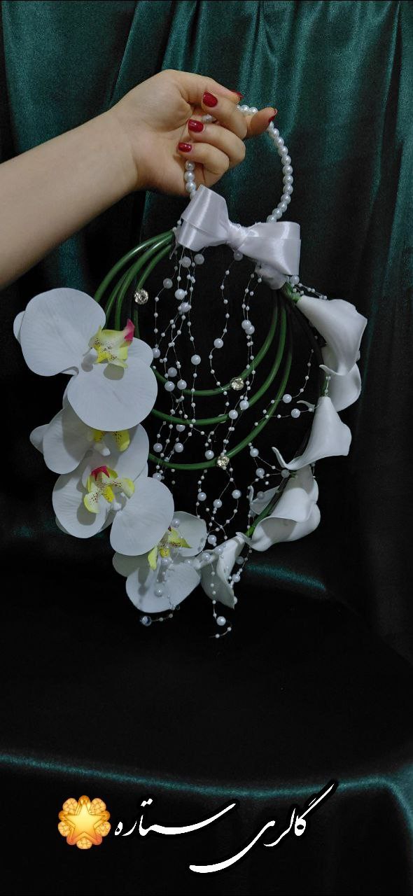 دسته گل عروس مدل شیپوری و ارکیده لمسی با دیزاین مرواریدی